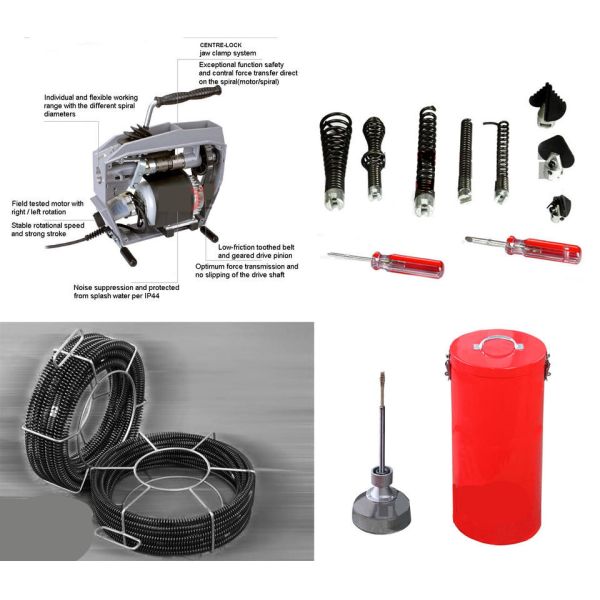 STD150 | Drain cleaning machine Motor: 750W induction type,reversible Speed: 460RPM For pipes: Φ20-150mm Max working length: 50m drill heads 16mm 4pcs 22mm 4pcs spirals 16mm 5pcs 22mm 5pcs | ||||